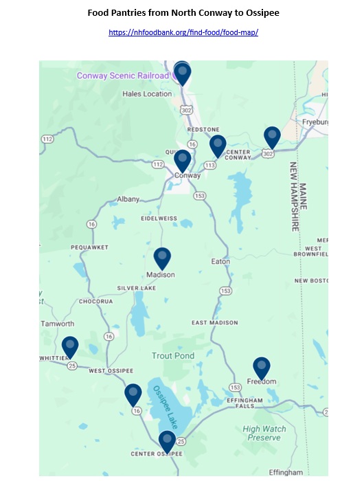 Here is a list and map of food pantries from North Conway to Ossipee, with links to the Mobile Pantry schedule and additional resources.