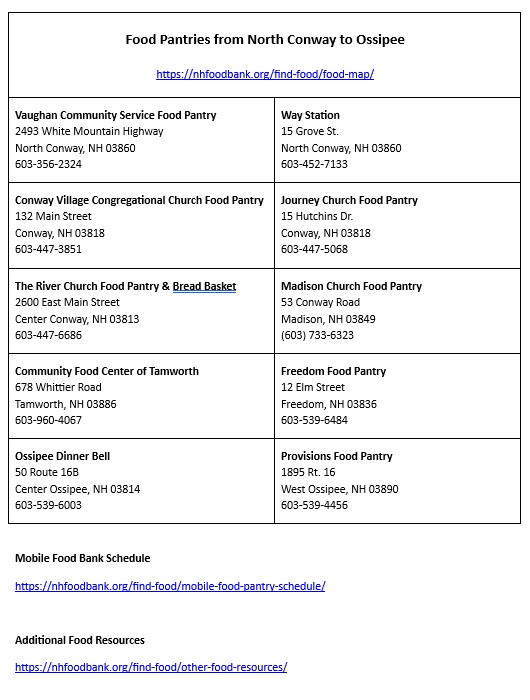 Here is a list and map of food pantries from North Conway to Ossipee, with links to the Mobile Pantry schedule and additional resources.